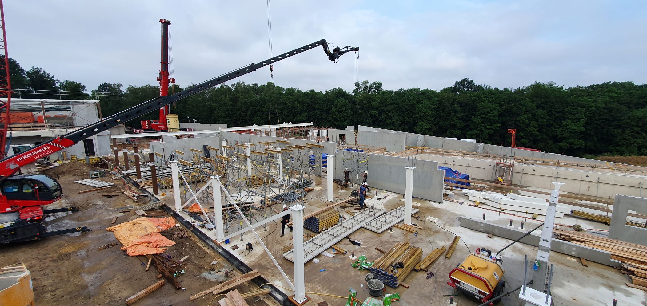 Op dit moment zijn we bezig met de laatste werkzaamheden van de begane grondvloer van het zwembad en de horeca, zodat de staalconstructie en de prefab van het zwembad gemonteerd kunnen worden. Van de sporthal is de staalconstructie al gemonteerd en zijn we druk bezig om de verdiepingsvloeren gereed te maken. De parkeergarage is voor driekwart gereed en volledig opgebouwd uit prefab onderdelen (kolommen, balken en kanaalplaatvloeren). Volgens de laatste planning ronden wij onze werkzaamheden voor de bouwvak af, zodat de hoofdaannemer met de afbouw kan beginnen. Het gebouw wordt dan medio 2022 in gebruik genomen.